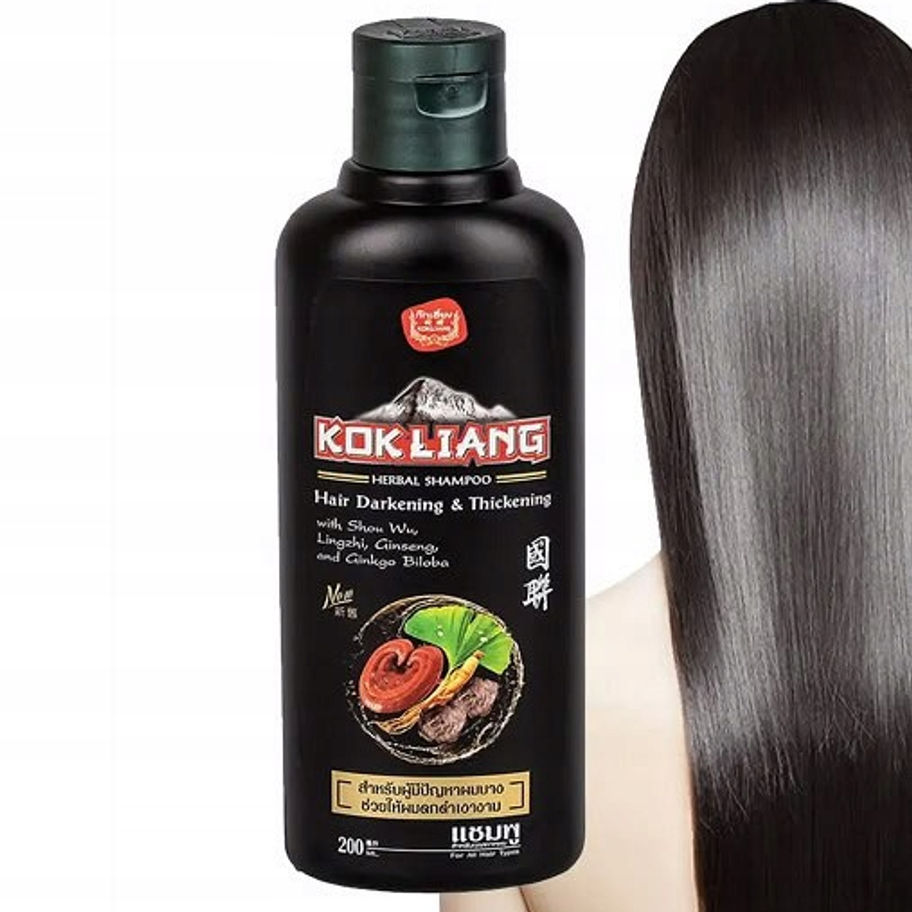 Tajski ziołowy szampon Kokliang stworzony specjalnie dla włosów ciemnych, cienkich i osłabionych. Formuła bez siarczanów („sulfate-free”) łączy ekstrakty z żeń-szenia, miłorzębu (ginkgo biloba), grzyba lingzhi i zielonej herbaty, które wspierają naturalny kolor włosów, pobudzają wzrost i przywracają zdrowy blask.