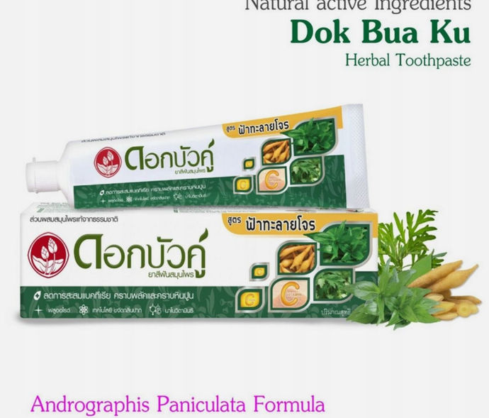 Pasta do zębów Dok Bua Ku Andrographis Paniculata to wyjątkowy produkt stworzony na bazie tajskiej tradycyjnej medycyny ziołowej. Wzbogacona o ekstrakty z roślin leczniczych oraz nowoczesną technologię eliminacji nieprzyjemnego zapachu pochodzącą z Japonii, zapewnia skuteczną i bezpieczną pielęgnację jamy ustnej przez cały dzień.